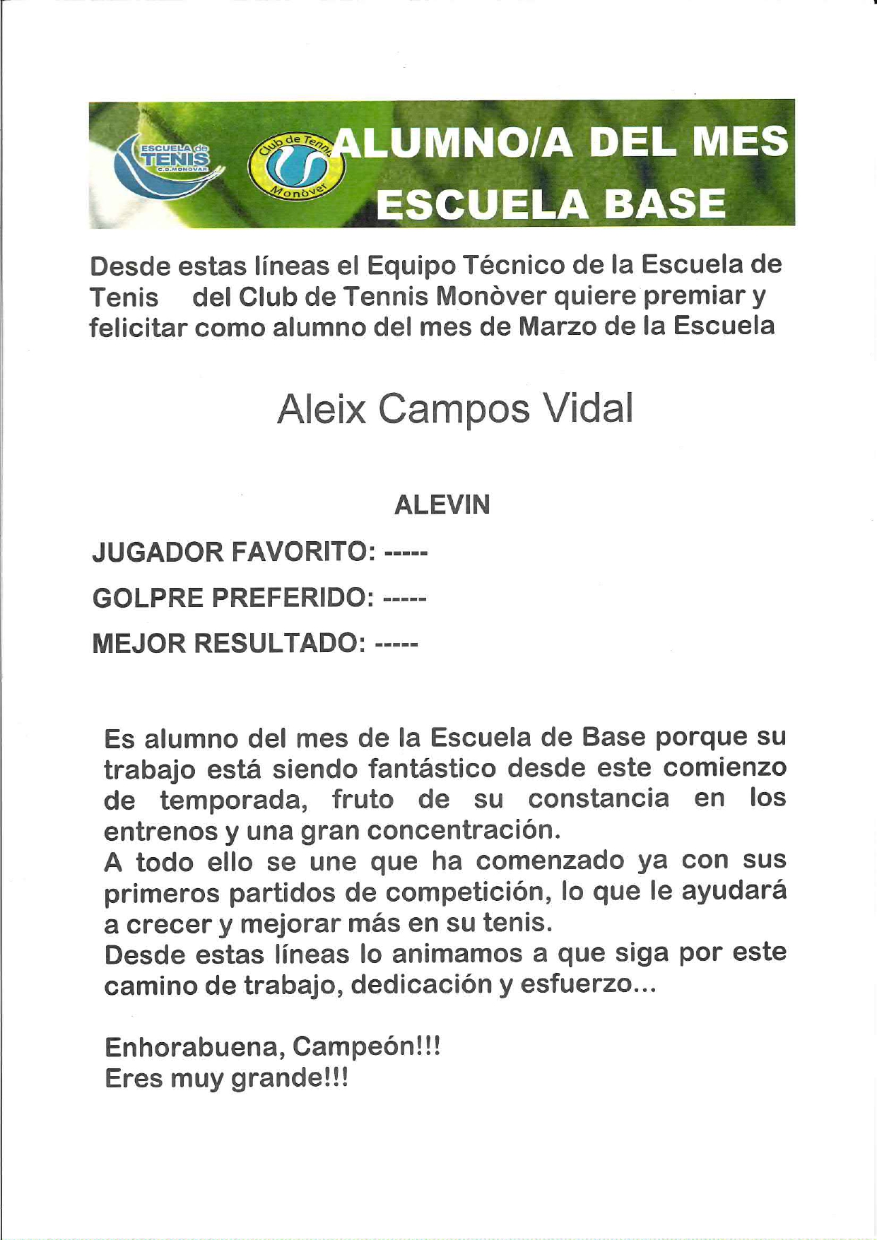 Desde estas líneas el Equipo Técnico de la Escuela de Tenis del Club de Tennis Monòver quiere premiar y felicitar a Aleix Campos Vidal como alumno del mes de Marzo de la Escuela de Base por: