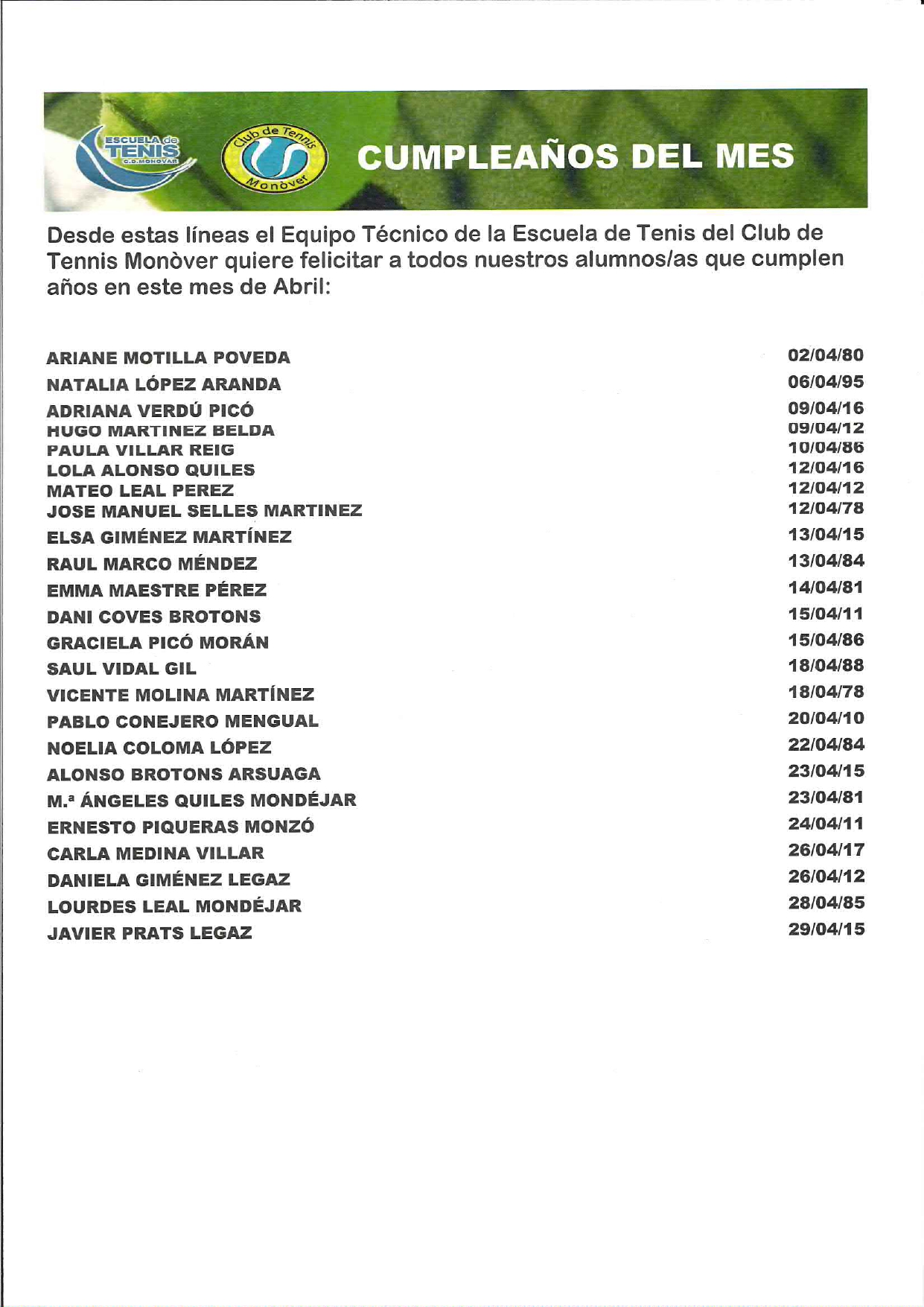 Desde estas líneas el Equipo Técnico de la Escuela de Tenis del Club de Tennis Monòver quiere felicitar a todos nuestros alumnos/as que cumplen años en este mes Abril.