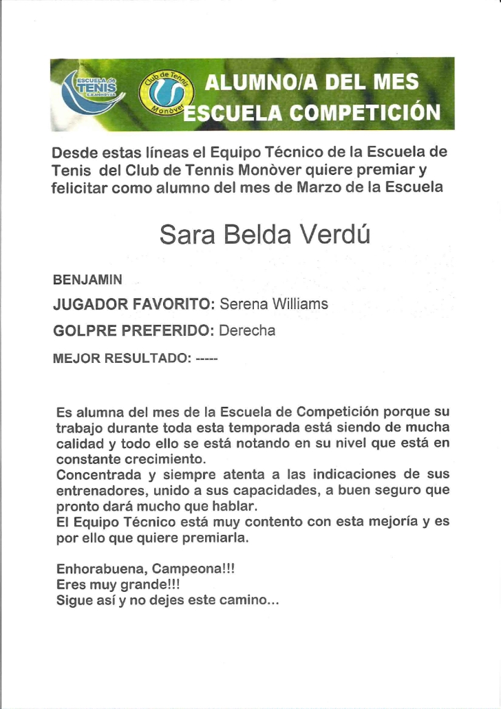 Desde estas líneas el Equipo Técnico de la Escuela de Tenis del Club de Tennis Monòver quiere premiar y felicitar a Sara Belda Verdú como alumna del mes de Marzo de la Escuela de Competición por: